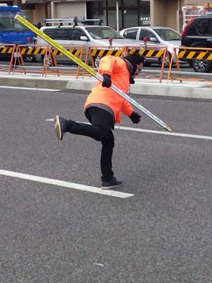 (長谷川所員が測定器を覗きます 😮 その先は・・・森本所員の持つ物差しの目盛りを測定します交通量の多い場所には目立つ色目の衣装で 😀 )